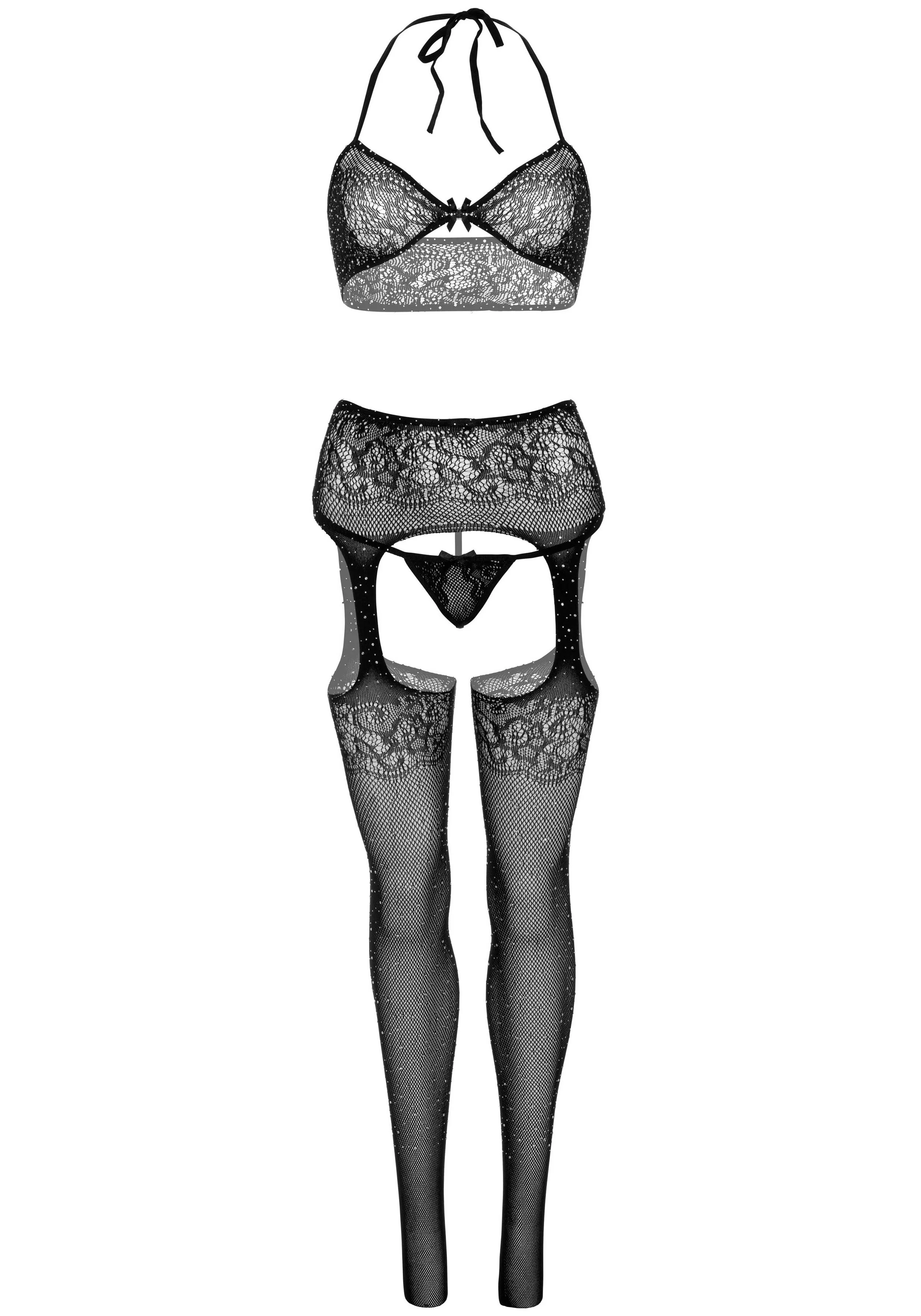 - Beschreibung Entdecken Sie dieses elegante Dessous-Set, das ein weiches Spitzenoberteil mit Strass- und Schleifendetails, einen sexy passenden String und Netzstrümpfe mit Strumpfhalter enthält. Perfekt für besondere Anlässe wie Valentinstag oder Weihnachten, wird dieses Set Sie sinnlich und feminin aussehen las… Mehr