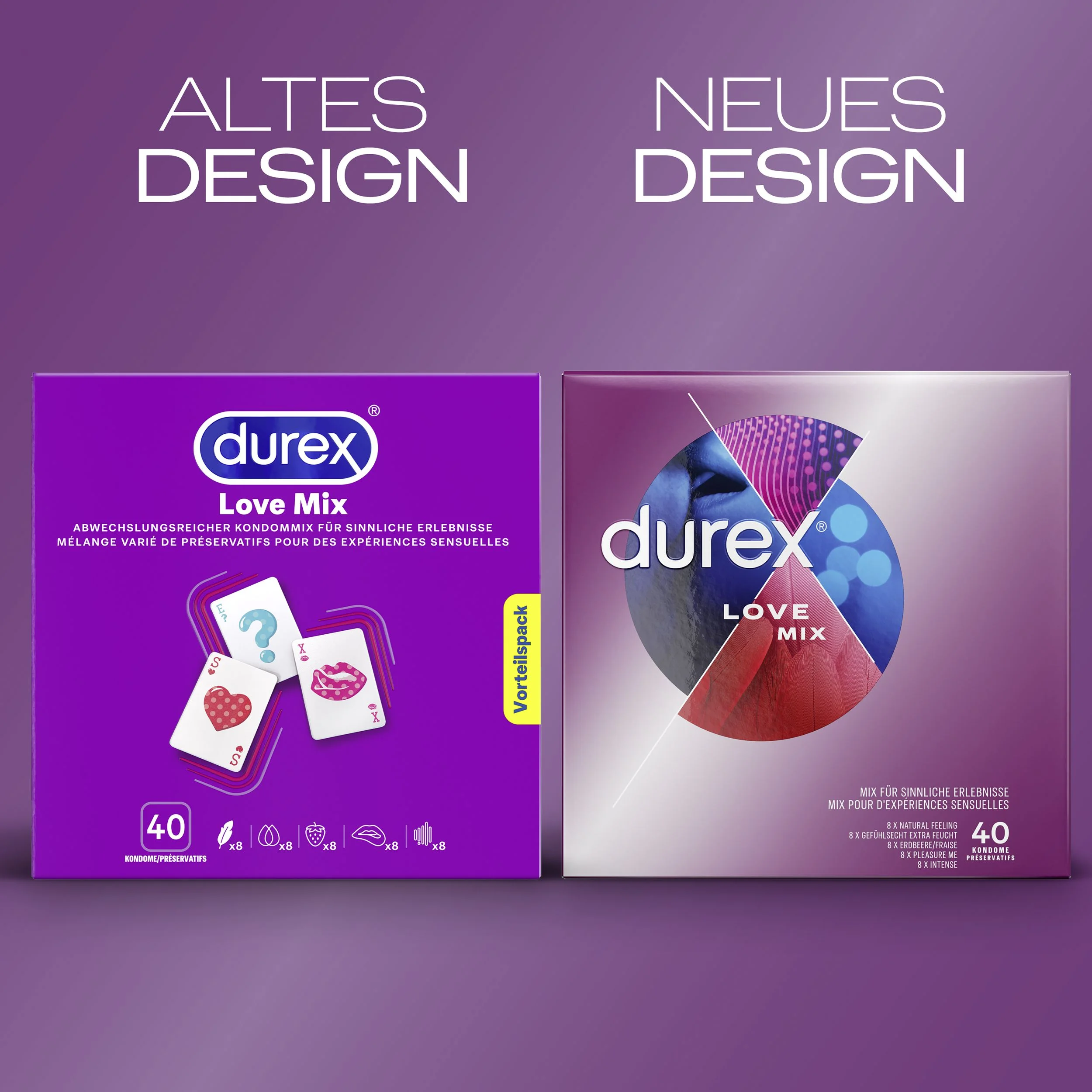 - Beschreibung Mehr Abwechslung und Spaß beim Safer Sex! Diese Vorratspackung Love Mix enthält 40 Durex-Kondome in der altbekannten, besten Qualität und in 5 verschiedenen, spannenden Sorten: 8 x Gefühlsecht Ultra 8 x Gefühlsecht Extra Feucht 8 x Gerippt/Genoppt 8 x mit Erdbeeraroma 8 x Gerippt/Genoppt mit Desire… Mehr