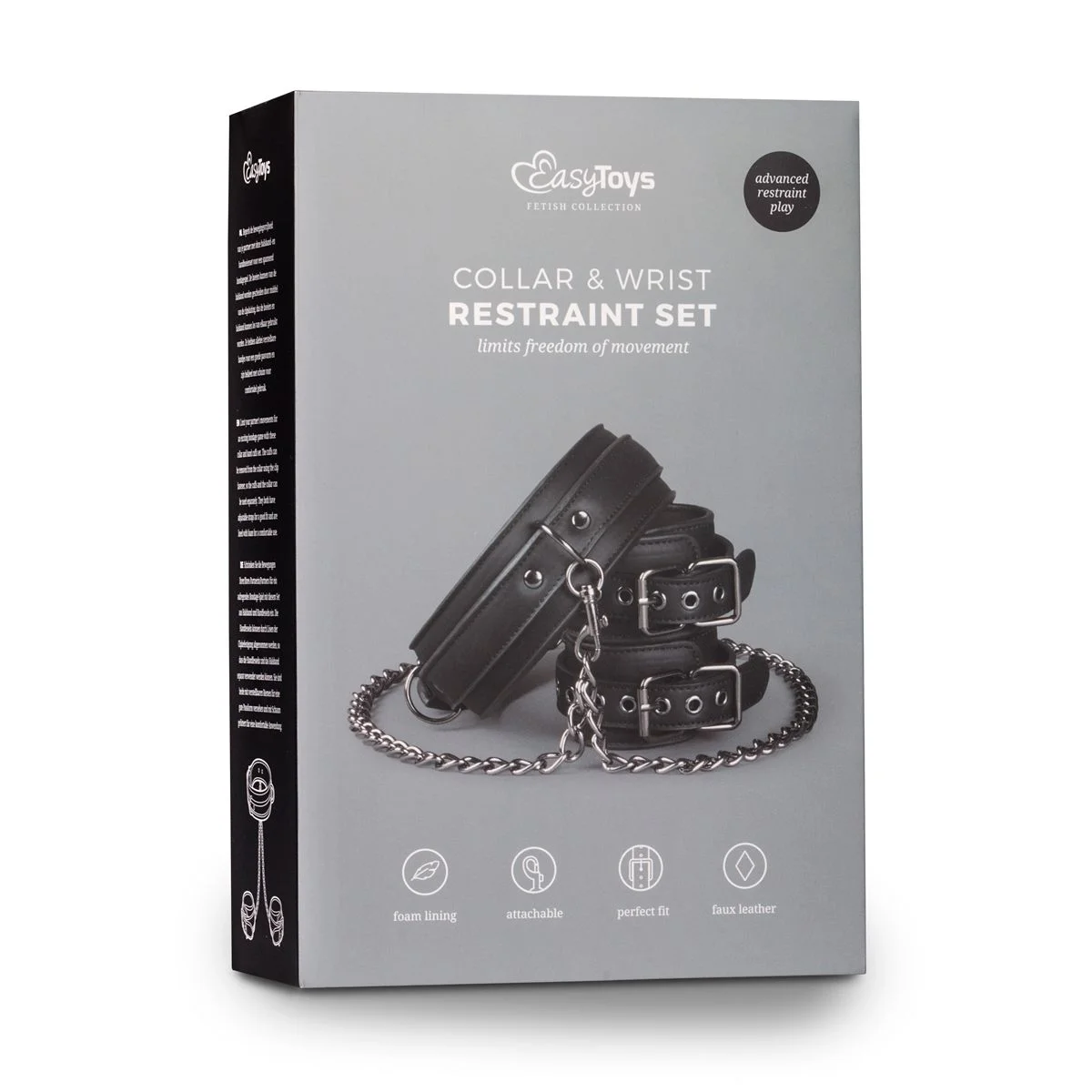 De set wordt geleverd in een zwarte bewaardoos van de Excitante Fetish Collection. Ik heb al een spreidstang uit dezelfde collectie en die was geleverd in een bijpassende doos. De boeien zelf zijn gemaakt van kunstleer en voelen zwaar aan. De binnenkant is bekleed met een dun laagje schuim en stof. Ze zijn absoluut mooi afgewerkt. De stiksels zijn netjes en alles voelt solide aan. Er zitten drie D-ringen aan de collar en een per boei. De manier van bevestigen is per clipsluiting. Naast de boeien en de collar wordt er ook een ketting meegeleverd. Deze is 40 cm lang en is gemaakt van metaal.