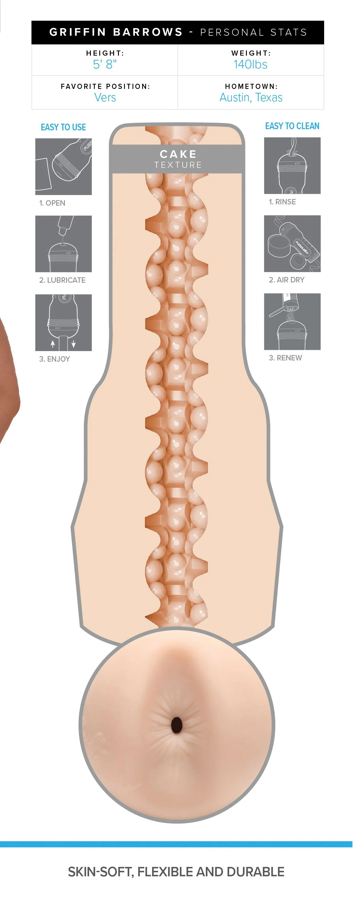 - Beschreibung Lass dich von Griffin Barrows verwöhnen, einem köstlichen Masturbator mit Anusöffnung, der dem berühmten Pornostar nachempfunden ist. Die Fleshjack Boys-Serie ist für ihr diskretes Design bekannt und macht ihrem Namen alle Ehre. Der herausnehmbare Lustkanal besteht aus SuperSkin, einem körperverträ… Mehr