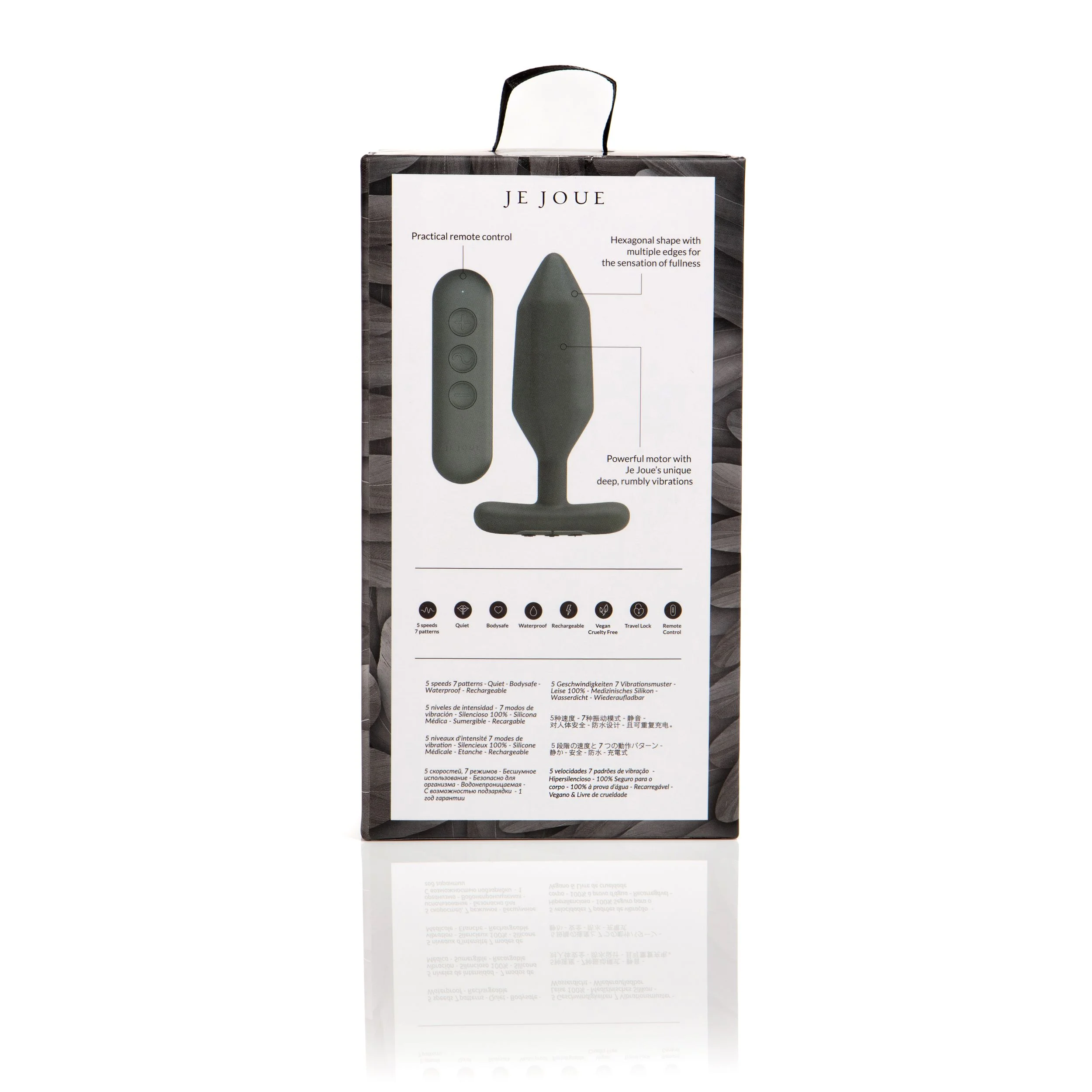 Zwarte buttplug met afstandsbediening geeft direct een voller gevoel tijdens gebruik. De Je Joue - Onyx Butt Plug with Remote Control is gemaakt voor gebruikers die meer willen dan een glad, eenvoudig model. De zeshoekige vorm en voelbare randen maken elke beweging duidelijker merkbaar. Daardoor voelt deze anal plug steviger en gerichter aan dan een standaard plug. De verzwaarde kern versterkt dat effect nog eens extra, vooral wanneer je beweegt, draait of licht aanspant. Dit model past daarom beter bij wie al ervaring heeft met anaal speelgoed of klaar is voor een volgende stap. Voor complete starters kan deze vibrerende buttplug vrij intens aanvoelen. De zwarte afwerking houdt het geheel strak, terwijl de brede voet extra zekerheid geeft tijdens solo gebruik of samen.