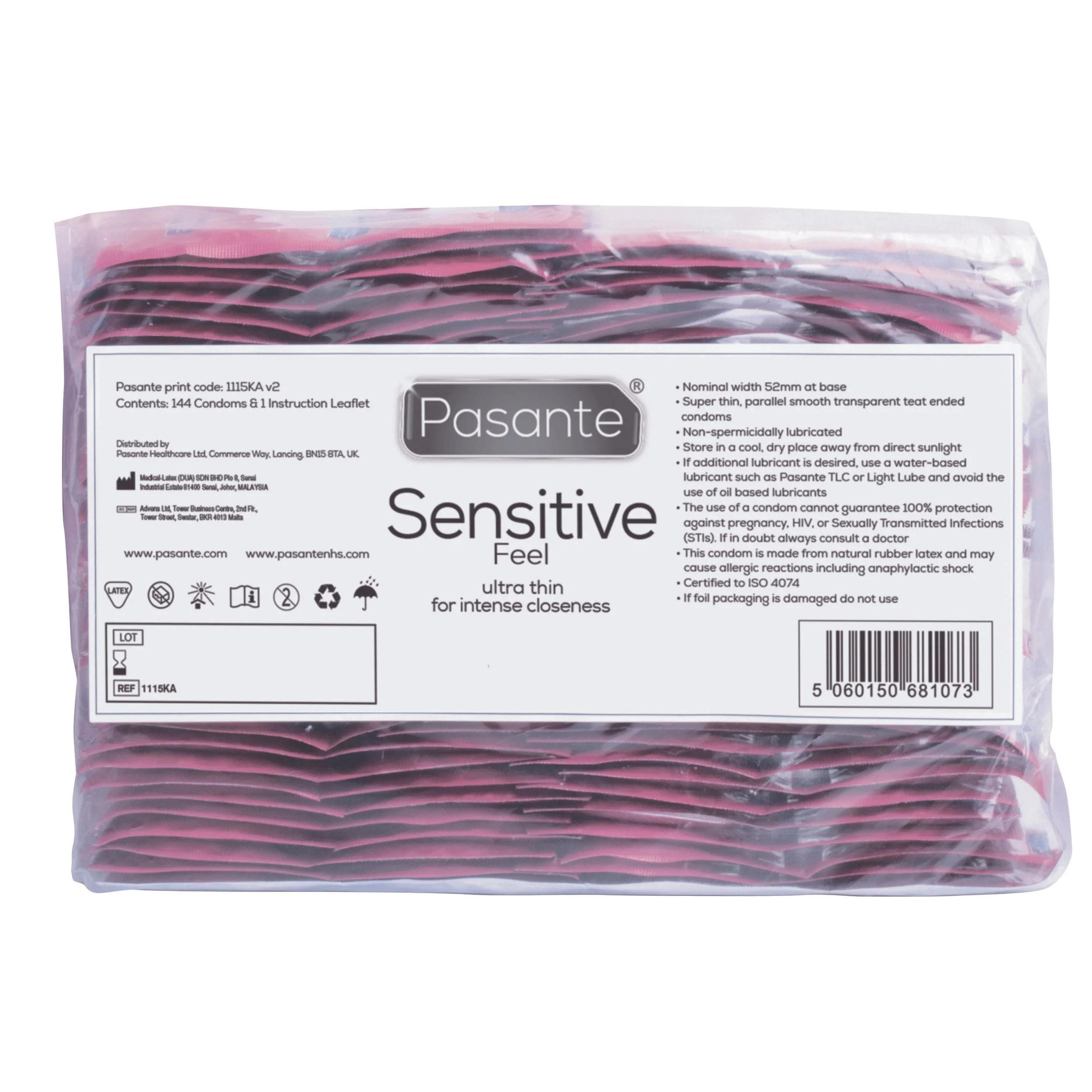 Das Pasante Sensitive Kondom ist dünner als die meisten Standardkondome Wegen der guten Wärmeleitfähigkeit fühlen Sie die gleiche intensive und aufregende Erfahrung, wie wenn Sie kein Kondom tragen würden. Die transparenten Kondome sind aus Naturlatex, befeuchtet und mit Reservoir. Merkmale: - Geschmack: Neutral - Gleitmittel: Normal - Farbe: Transparent - Struktur: Glatt - Größe: Mittel - Nennweite: 52 mm - Dicke: Ultra Dünn - Paketmenge: 144 Stück - Marke: Pasante Empfohlen für: Im Allgemeinen ist jedes getestete Kondom für vaginalen, oralen und analen Kontakt sicher, solange die Passform gut ist und es mit ausreichend Gleitmittel befeuchtet ist.