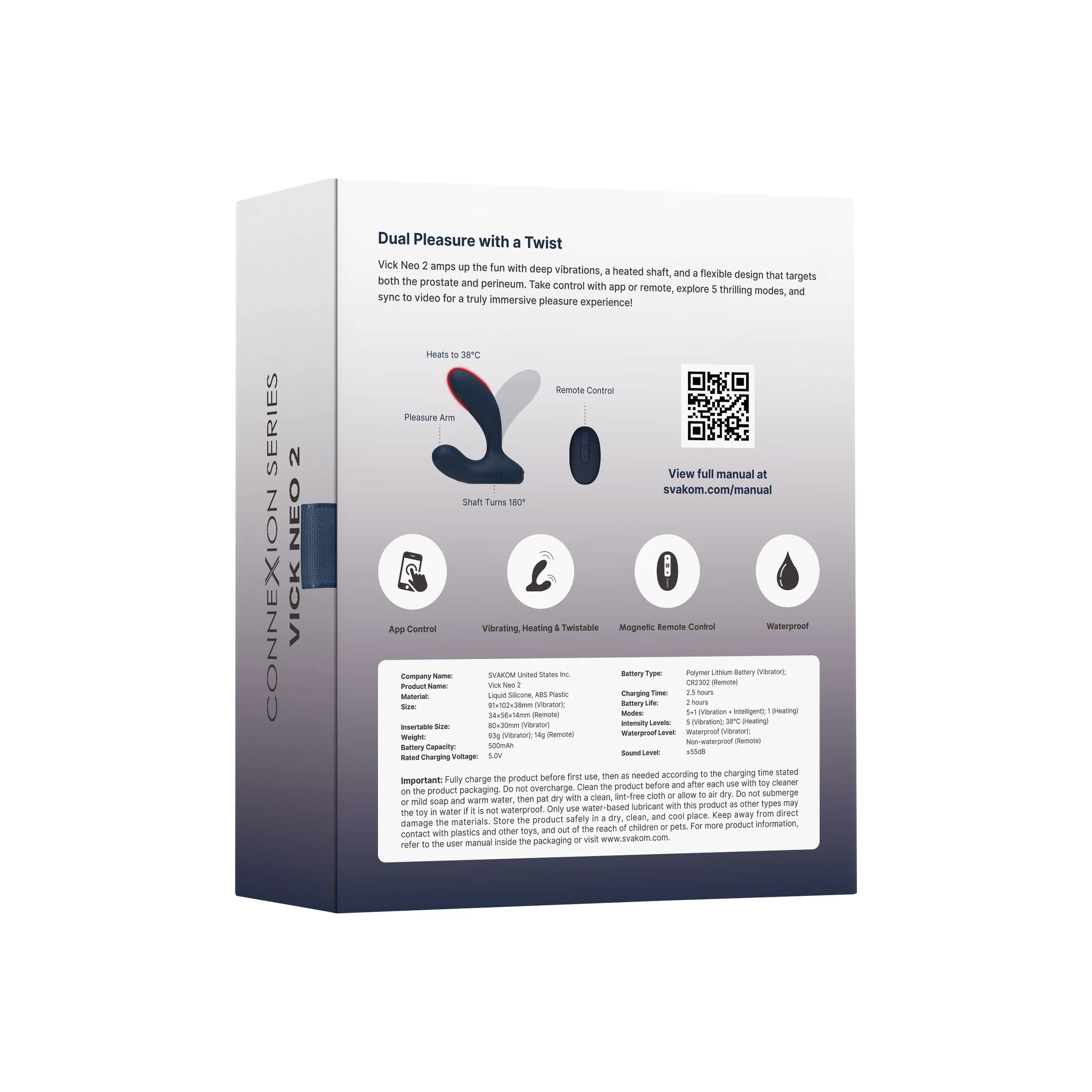 - Beschreibung Entdecke den Svakom Vick Neo 2 – Doppeltes Vergnügen mit einem Twist Erlebe neue Lustgefühle mit dem Svakom Vick Neo 2. Dieser innovative Vibrator wurde für Männer entwickelt, die tiefe Prostatastimulation mit intensiver äußerer Vibration suchen. Mit seinem 180° drehbaren Hals und der Erwärmung auf… Mehr