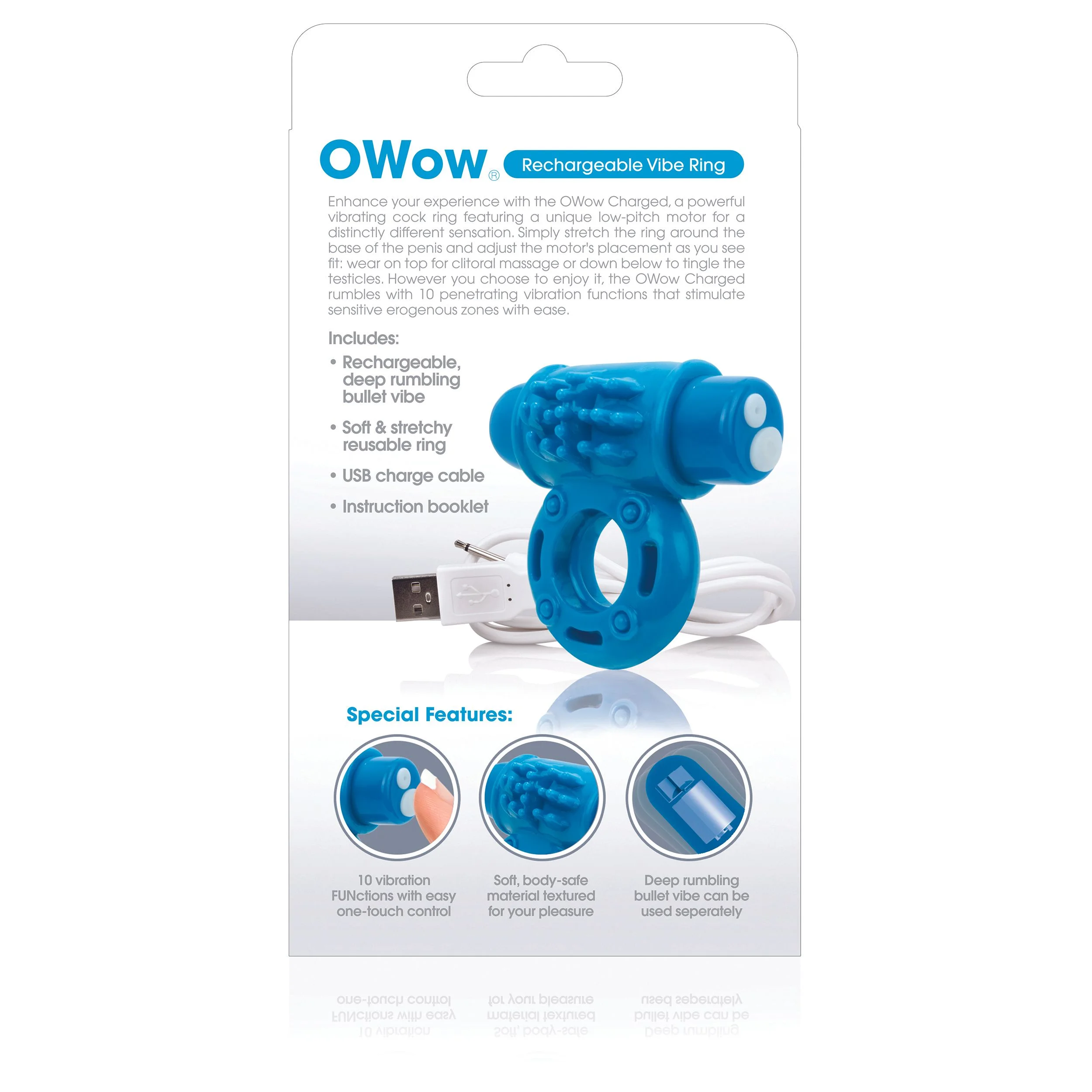 De Charged OWow Vibe Ring onderscheidt zich door zijn geavanceerde Vooom low-pitch motor die diepe, intense trillingen produceert. Met maar liefst 10 verschillende vibratie- en pulsatieopties is er voor iedere stemming en voorkeur een passende stand. Deze variatie zorgt voor unieke sensaties die spanning en plezier tijdens het samenzijn blijven prikkelen. Dankzij de krachtige motor ervaar je stevige, duidelijke vibraties die niet alleen jou, maar ook je partner via de clitoris en erogene zones stimuleren.